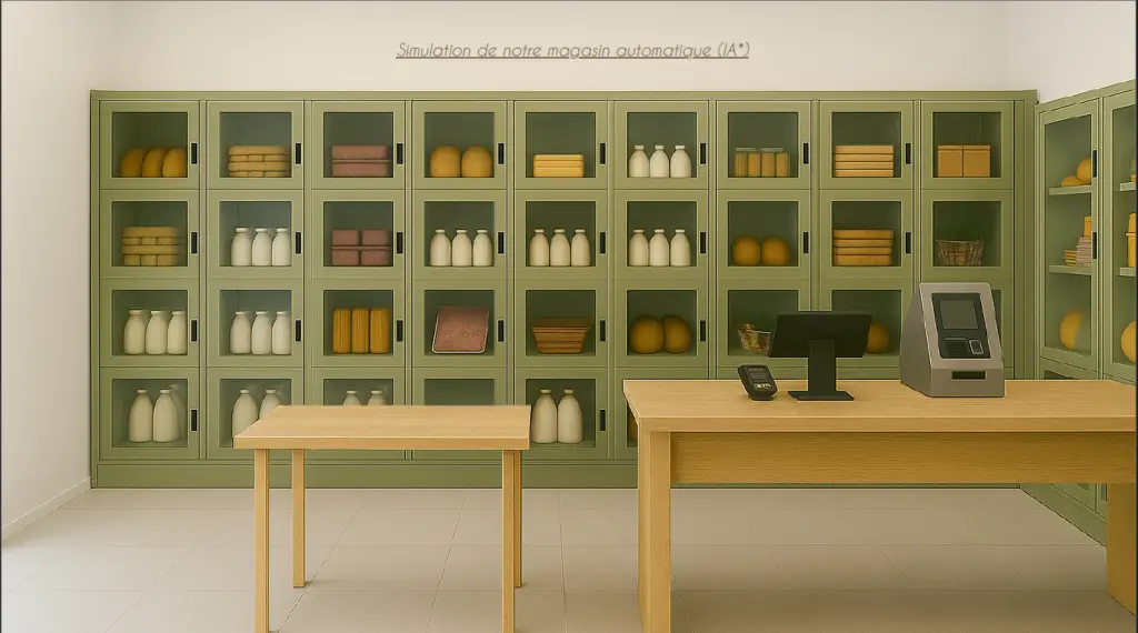 Notre concept : un magasin automatique proposant des produits locaux, vendus à l’unité en centre ville. Qui ne s’est jamais retrouvé un dimanche à vouloir faire des crêpes… sans œufs ? Notre solution répond à ces besoins du quotidien grâce à la vente de produits essentiels, comme des œufs à l’unité, accessibles facilement en centre-ville, à tout moment.